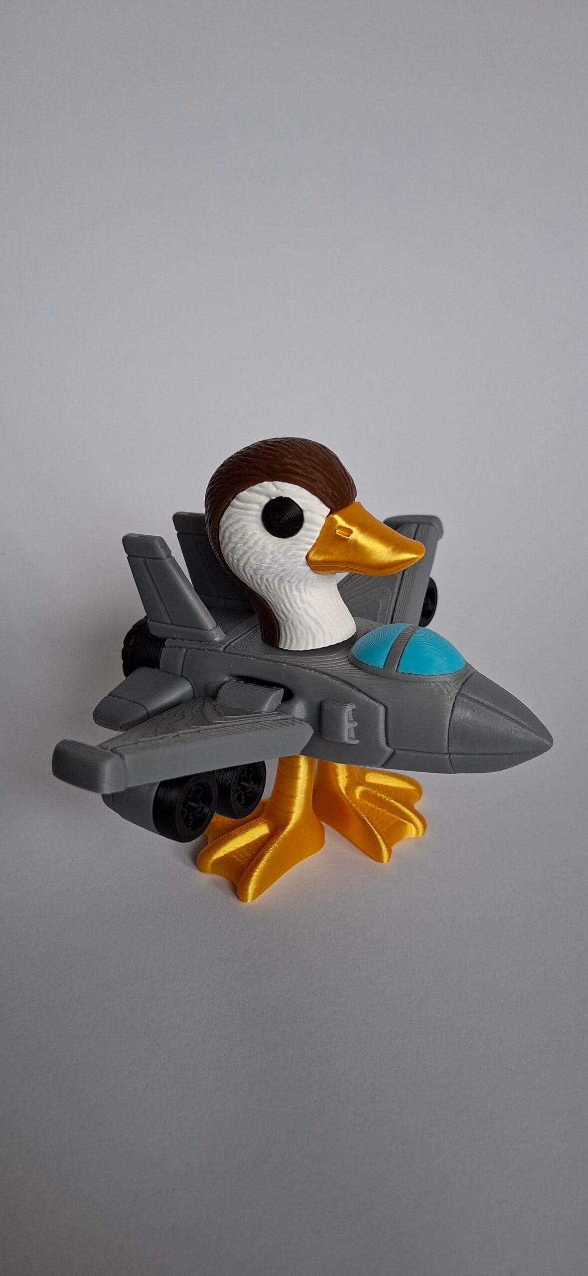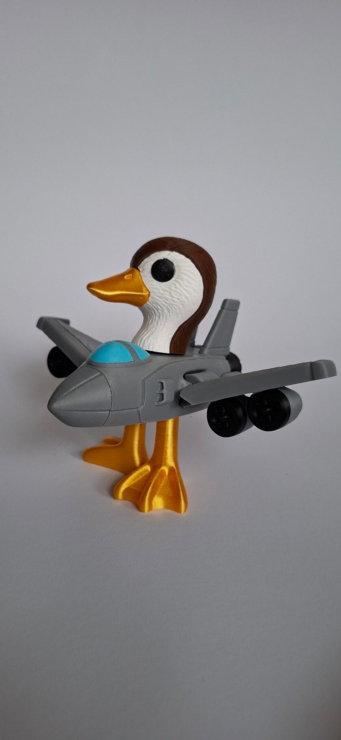 Bombombini Gusini on tõeliselt omapärane 3D-prinditud tegelane, mis ühendab parte pea ja jalad kaasaegse hävituslennuki kerega. Selline ootamatu ja naljakas kombinatsioon loob mänguasja, mis on samaaegselt dünaamiline ja humoorikas. Tema kuldne nokk, terav pilk ja väikesed tiivad annavad talle erilise iseloomu, mis paneb inimesed naeratama.